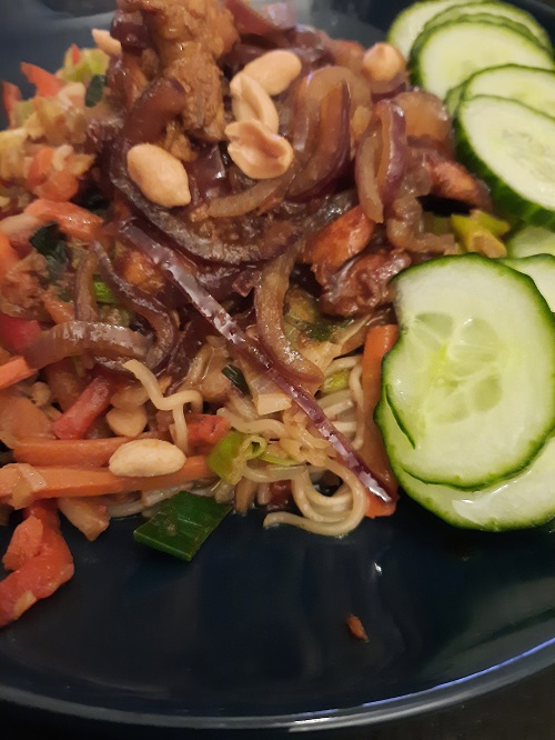 De tweede maaltijd was een zekerheidje. Ons zoontje is helemaal verzot op noedels en dan nog met kip en een saus, dit zou een hit zijn en dat werd het voor hem ook zeker. Eerlijk is eerlijk zo lekker als de panzanellasalade van de dag ervoor was het niet, maar wel een heel degelijke doordeweekse maaltijd met veel smaak. Toen ik het gerecht aan het klaarmaken was en ik de losse onderdelen proefde was ik niet geheel overtuigd, maar alles bij elkaar middelde alle zware en uitgesproken smaken elkaar goed uit en werd het een smakelijk geheel.