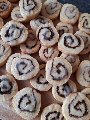 Voor het bakken. Verwarm de oven voor op 180 graden. Bekleed een bakplaat met bakpapier of siliconen bakmat. Haal de deegrollen uit de koelkast. Snijd de rollen in ongeveer 18 gelijkmatige stukken. Leg de stukjes met de snijkant naar boven, 3 cm uit elkaar, op de bakplaat. Bak de koekjes in 10-11 minuten, totdat de zijkanten goudbruin beginnen te worden. Haal uit de oven en laat helemaal afkoelen voor je ze kunt glazuren.